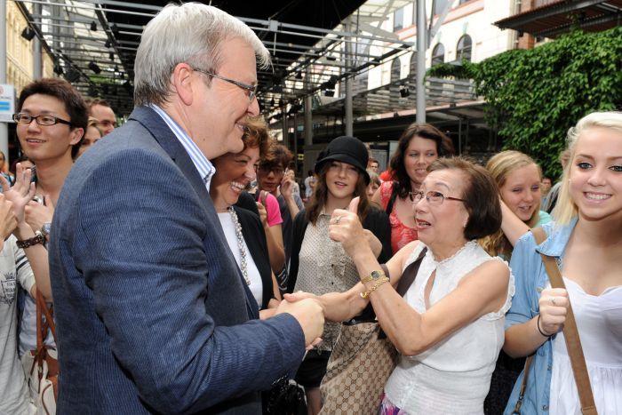 (Picture shows former Prime Minister Kevin Rudd greeting supporters in Brisbane, February 25 2012. They are wishing him the best for the Labor leadership spill, which he lost)