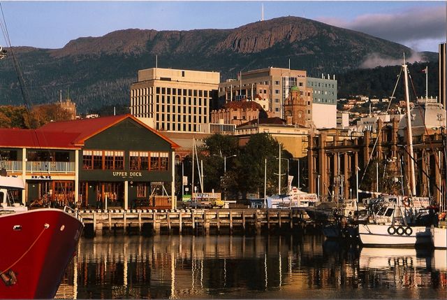 (Photo shows view of Mt Wellington across Hobart docks in autumn)