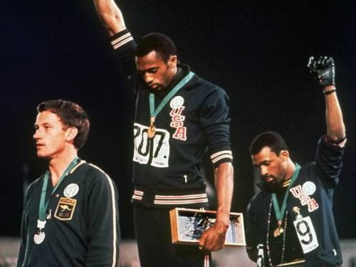 The other medal winners were American athletes Tommie Smith (gold) and John Carlos (bronze), with Tommie setting a world record time of 19.83 seconds. At the medal ceremony, as Tommie and John faced the American flag and heard The Star Spangled Banner, they raised their fists in a Black Power salute, and bowed their heads, as part of a protest on behalf of the civil rights movement.