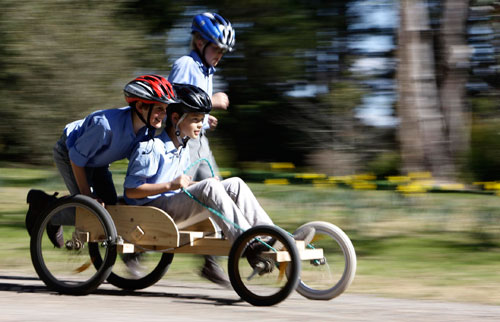 (Photo shows boys riding a billycart at Tudor House prep school in Moss Vale, New South Wales)