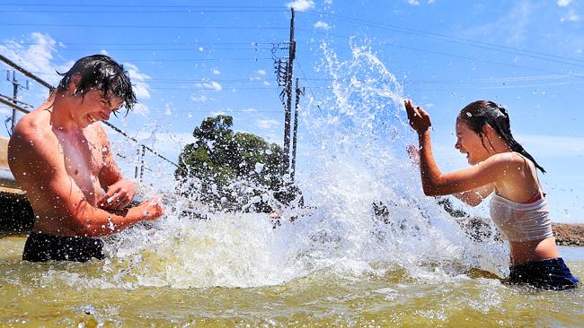 (Picture shows Caleb Tremellen and Hayley Lincoln trying to keep cool near Kyabram in regional Victoria during the record-breaking heatwave across southern and eastern Australia this week)