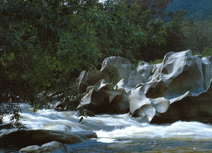 (Photo shows Thredbo River flowing over rocks in the Snowy Mountains region)