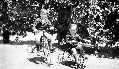 (Picture shows two boys riding their tricycles amongst grape vines in Mildura, Victoria in the 1920s; photo from Museum Victoria)